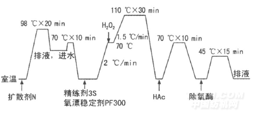 藥品 精練劑3S,除氧酶,片堿,擴(kuò)散劑N,過氧化氫,勻染劑RCO,柔軟劑,液體蠟(市售);活性黃H-E4R,活性紅H-E3B,活性藍(lán)H-ERD(永光化學(xué));氧漂穩(wěn)定劑PF300,皂洗劑AST,固色劑EVL(上海佳和);氯化鈉,純堿,醋酸(99. 8%,工業(yè)級(jí))。