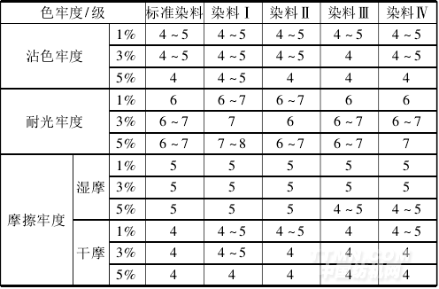 耐光牢度可以達到6 ~8 級,且隨著染色深度的增加而提高。染料Ⅰ的耐光牢度高于其它染料。