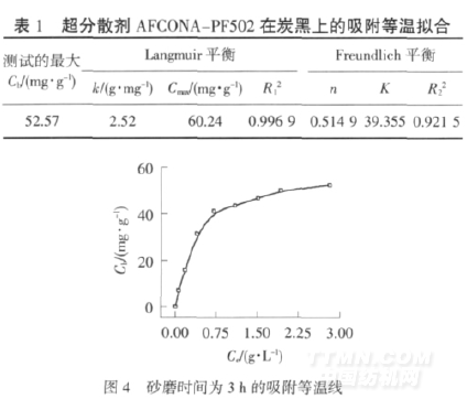 (1)砂磨時間為1min的炭黑色漿體系的吸附等線屬于Nernst分配模型;砂磨時間為3h的炭黑色漿體系的吸附等溫線符合Langmuir模型,屬于單分子層化學吸附.