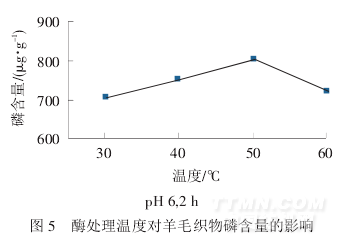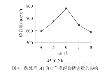 酶處理pH 值對羊毛織物磷含量的影響見圖4.