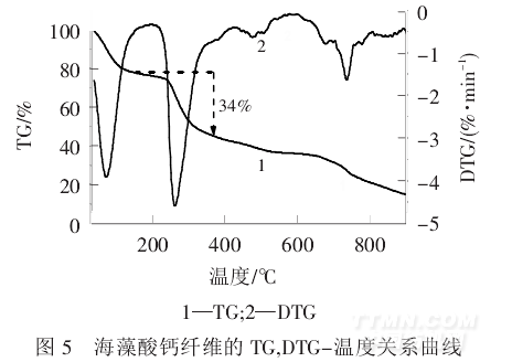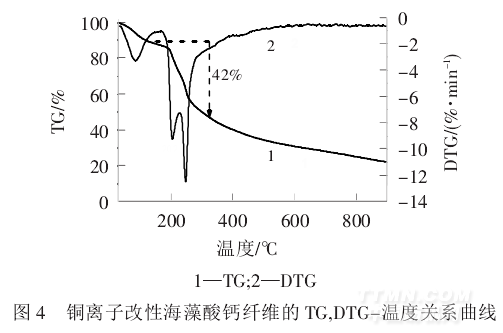從圖4 和圖5 可以看出,銅離子改性前后海藻酸鈣纖維的熱分解過程差異較大.海藻酸鈣纖維的熱分解分4 步進行,而銅離子改性海藻酸鈣纖維的熱分解分3 步進行,分別是纖維失去結(jié)合水階段、主要裂解階段和殘渣裂解階段.從圖4 的DTG 曲線可以看出,纖維的主要裂解階段有2 個峰,由于纖維中同時含有銅離子和鈣離子,而這2 種離子和纖維大分子的結(jié)合方式不同,使得纖維中2 種結(jié)構(gòu)的裂解存在差異.[16]此外,從圖4 和圖5 還可以看出,銅離子改性海藻酸鈣纖維在主要裂解階段的失重是42%,而海藻酸鈣纖維是34%.這說明銅離子改性破壞了海藻酸鈣纖維的結(jié)構(gòu),使其熱裂解過程發(fā)生變化.另外,極限氧指數(shù)由34.4%下降到17.8%.說明銅離子改性后海藻酸鈣纖維的結(jié)構(gòu)發(fā)生了變化,造成阻燃性能下降.