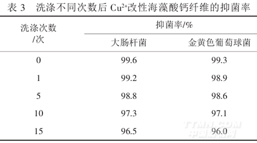 抗菌耐久性是衡量纖維抗菌性能實用性的重要指標(biāo)之一,洗滌不同次數(shù)后Cu2+改性海藻酸鈣纖維的抑菌率見表3.