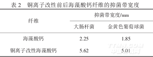 銅離子改性前后海藻酸鈣纖維的抑菌帶寬度見表2.