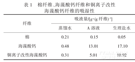 棉纖維、海藻酸鈣纖維和銅離子改性海藻酸鈣纖維的吸濕性見表1.