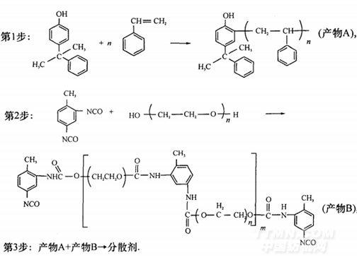 按照Ffiedel-Crafts反應(yīng),本實驗用4-枯基酚和苯乙烯為原料,酸性催化劑為催化劑,將苯乙烯鏈段接在4-枯基酚的鄰位上形成酚類產(chǎn)物,再通過過量的TDI和聚乙二醇6000反應(yīng)生成端基含NCO的預(yù)聚物,然后將過量的酚類產(chǎn)物和預(yù)聚物反應(yīng)合成所需的高分子分散劑[2-3].反應(yīng)步驟如下: