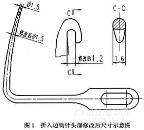 1.1.2.4 對(duì)鉤針頭部進(jìn)行了如圖1所示的處理,鉤針的根部尺寸不變,以保持一定的強(qiáng)度,而緯紗會(huì)卷繞到的過(guò)渡段從φ2mm改進(jìn)為φ1.5mm,此時(shí)以緯紗的中心計(jì)算,繞一圈的周長(zhǎng)為L(zhǎng)=πD=3.14×2.5=7.85mm,從理論上保證了緯紗不會(huì)滑出壓腳;另外,對(duì)鉤針頭部適當(dāng)增大尺寸后,將溝槽增大至1.2mm,并進(jìn)行適當(dāng)?shù)膱A整。再經(jīng)過(guò)我們的仔細(xì)觀察和細(xì)心調(diào)節(jié),使折入邊裝置的鉤針、剪刀壓腳和鋼筘、織機(jī)開(kāi)口等配合完美,最后織物光邊的折入穩(wěn)定性和織物邊平直度達(dá)到了理想要求。