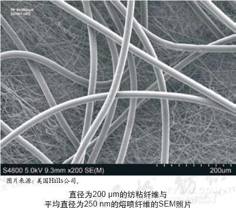 美國(guó)Hills公司利用專(zhuān)利的“薄金屬板”擠出模頭使熔噴非織造纖維的細(xì)度又有了新的飛躍。該公司利用高熔融指數(shù)PP和特殊模頭能制造出平均纖度達(dá)250nm的熔噴纖維,纖維纖度范圍為25~400nm。為了在合理的生產(chǎn)率下生產(chǎn)出這種超細(xì)纖維,其特殊模頭采用的噴絲板孔數(shù)達(dá)到100孔/英寸或者更高,同時(shí)其長(zhǎng)徑比也極大。這些工藝條件使熔噴纖維達(dá)到了只有靜電紡絲才能達(dá)到的纖度。