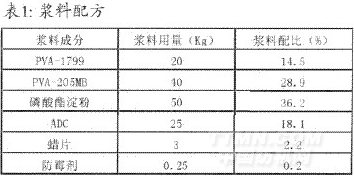 由于本產(chǎn)品為純棉細特高密織物,總經(jīng)根數(shù)多、經(jīng)紗密度大,漿紗采用24只經(jīng)軸進行并合,織軸幅寬277.5cm,上漿困難,加之紗線較細,強力較低,織造難度系數(shù)也大。如果上漿率偏小,或者上漿不勻,則不能很好的伏貼毛羽,容易造成斷經(jīng),再加上高速噴氣織機開口又小,如果開口不清,極易造成阻緯,導致產(chǎn)生疵布。因此,此品種上漿時既要有較好的浸透以適當增強,又要有良好的被覆以貼伏毛羽,并形成柔韌光滑的漿膜以增加耐磨,以保證開口清晰,適應噴氣織機高速、大張力的織造要求。本著既能達到上漿質量、滿足織造及成品要求,又盡量少用PVA、減少環(huán)境污染,同時兼顧漿紗成本的原則。采用的漿料配方如表1所示: