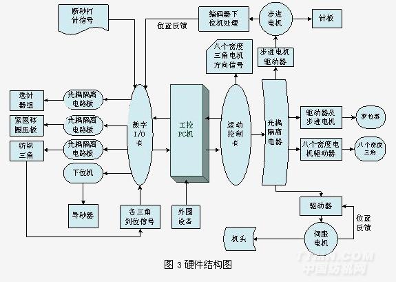圖3給出了電腦橫機(jī)控制系統(tǒng)的硬件結(jié)構(gòu)圖。以工控機(jī)為中心,配以鍵盤,鼠標(biāo)等外圍設(shè)備。運(yùn)動(dòng)控制卡具有三個(gè)運(yùn)動(dòng)通道,可以實(shí)現(xiàn)三軸聯(lián)動(dòng),運(yùn)動(dòng)控制卡外接光耦隔離電路板,大部分外接信號(hào)通過該電路板,運(yùn)動(dòng)控制卡和工控PC進(jìn)行通訊。數(shù)字IO卡則用來處理大量的數(shù)字信號(hào),該卡用于控制電腦橫機(jī)的運(yùn)動(dòng)部件:選針器,集圈壓板,移圈壓板等。