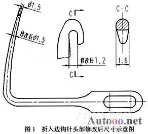 1.2.1玻璃纖維的原料品種繁多,千變?nèi)f化:有的比頭發(fā)絲還細(xì),有的又粗如電線。對(duì)細(xì)的玻璃纖維要盡量縮小鉤針頭部尺寸,以避免鉤針插下時(shí)帶斷經(jīng)紗;對(duì)粗的線,要象織黃麻織物一樣,對(duì)鉤針頭部進(jìn)行如圖1所示的處理。