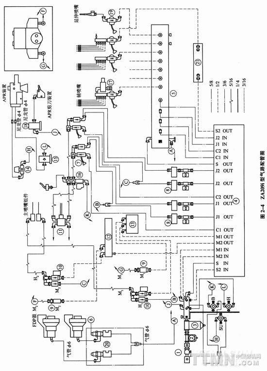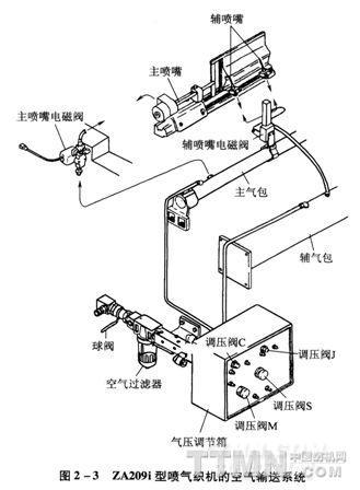 噴氣織機的空氣輸送系統(tǒng)是由空氣壓縮機出來的壓縮空氣,經(jīng)過配管到達織機上的空氣過濾器,過濾后的空氣經(jīng)過氣壓調節(jié)箱內的調壓閥調節(jié)壓力后,分送到噴射裝置的各執(zhí)行器件。圖2—3為ZA209i型噴氣織機的空氣輸送系統(tǒng)。
