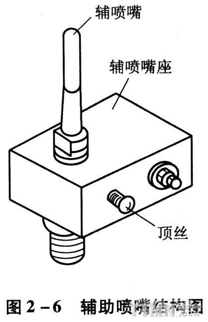又稱接力噴嘴,簡稱輔噴嘴它向著緯紗行進方向的斜上方噴射氣流。輔助噴嘴結(jié)構(gòu)圖見圖2—6。