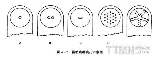 由于各種輔助噴嘴在其氣流進口處的管徑、管子長度、壓扁形狀、孔數(shù)及孔徑等都存在著差異,在供氣壓力相同的條件下,各種輔助噴嘴的出口風(fēng)速不盡相同。在生產(chǎn)中,單孔和多孔都得到了廣泛的使用。日本津田駒系列采用單孔輔助噴嘴、豐田JA采用雙孔,而歐洲各國多采用多孔的輔助噴嘴。輔助噴嘴噴孔示意圖見圖2—7。