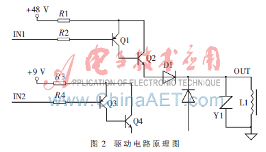 驅(qū)動(dòng)電路采用雙電壓方式,其原理圖如圖2所示。輸入信號IN1是8ms的單穩(wěn)態(tài)信號,控制48V電源打開電磁閥;輸入信號IN2是引緯的保持信號,控制9V的電源以保持電磁閥的打開狀態(tài);為了保證足夠的驅(qū)動(dòng)能力,兩路信號的驅(qū)動(dòng)三極管都采用達(dá)林頓方式;雙二極管D1是為了防止電源切換時(shí)48V電源串接到9V電源中;L1為引緯電磁閥,由于電磁閥為感性器件,在電磁閥關(guān)斷時(shí)OUT端因電感的儲能特性會(huì)出現(xiàn)一個(gè)比較高的負(fù)壓,若產(chǎn)生的負(fù)壓高于Q2和Q4三極管的最大承受電壓,則可能會(huì)損壞Q2和Q4三極管。這里的亞敏電阻Y1就是消減過高負(fù)壓的保護(hù)元件。