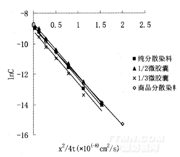 薄膜卷層法通過(guò)薄膜擴(kuò)散模擬了染料在纖維中的擴(kuò)散,即內(nèi)擴(kuò)散,以測(cè)定染料在纖維內(nèi)部的擴(kuò)散系數(shù)。將C. I.分散藍(lán)56濾餅、1/2MC、1/3MC及商品分散染料高溫高壓下染聚酯薄膜,并進(jìn)行剝色,繪制lnC-x2/4t圖并進(jìn)行線性擬合,如圖2所示,由此計(jì)