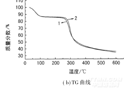 從圖4可看出,在相同條件下,未改性殼聚糖纖維的熱失重從112. 7℃就已開始, 264. 1℃已產(chǎn)生明顯的熱分解,當溫度升到300℃左右,質量損失急速增加,質量損失率約為49. 98%; 237. 1~458. 1℃為主要的裂解階段—殼聚糖纖維鏈裂解反應。與此相比,改性纖維的熱失重從118. 3℃開始, 286. 8℃迅速下降。286. 8~451. 1℃為主要的裂解階段,質量損失增加最大,此階段質量損失率約為48. 2%。比較圖4(a)和(b)可知,未改性殼聚糖纖維的初始失重溫度和最大熱失重速率溫度均比改性纖維要低,表明改性纖維的熱降解滯后于未改性殼聚糖纖維。這是因為硅偶聯(lián)劑、納米SiO2與殼聚糖纖維之間交聯(lián)網(wǎng)絡阻止了殼聚糖分子鏈的運動,要使殼聚糖纖維分子鏈在加熱過程中斷裂則需要較高的溫度。這也說明殼聚糖纖維聚合物鏈對SiO2納米顆粒的包覆作用主要是通過共價鍵,而不是氫鍵。正是由于這種包覆作用,改性纖維的熱穩(wěn)定性較未改性殼聚糖纖維有較明顯提高。