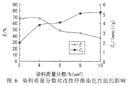 從圖6可以看出,直接桃紅12B上染百分率隨著染料質(zhì)量分?jǐn)?shù)的增加而下降,而上染量增加。直接桃紅12B在質(zhì)量分?jǐn)?shù)不大于4%時,上染率較高。因為改性纖維上存在可供染料定位吸附的位置,當(dāng)染料質(zhì)量分?jǐn)?shù)較低時,染料可以充分上染即占據(jù)染座;當(dāng)染料質(zhì)量分?jǐn)?shù)較高時,相對而言纖維上可吸附的位置減少,上染百分率降低,而纖維上吸附染料量仍呈增加趨勢。綜合考慮,選用染料質(zhì)量分?jǐn)?shù)4% (omf)較好。