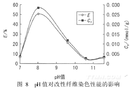 從圖8可以看出,在pH值為8時,染料在改性纖維上的上染率最高。隨著pH值的增加,上染百分率逐漸下降。直接染料在溶液中以染料陰離子形式存在,當(dāng)溶液中堿性越來越強(qiáng)時,會中和改性纖維上的正電荷,促使纖維呈負(fù)電性,使染料陰離子和雜化纖維陰離子相互產(chǎn)生較大斥力而不易相互靠近,從而影響了染料對改性纖維的染色性能,降低了染料對纖維的親和力而起到緩染作用。因此,改性纖維染色時以保持pH值8為宜。