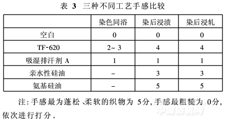 (2)吸濕排汗劑TF-620可改善織物的潤滑性,防止擦傷和雞爪印的產(chǎn)生。若采用染后浸漬或染后浸軋,織物的手感更為蓬松和柔軟,較部分親水性硅油好,與氨基硅油相差不