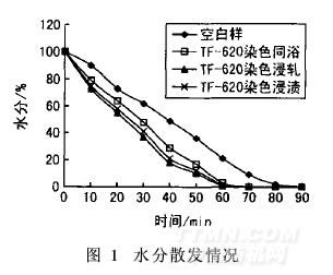經(jīng)吸濕排汗劑TF-620整理后,滌綸織物上的水分散發(fā)明顯加快,它是通過提高織物的吸濕性和導(dǎo)濕速度獲得的。其中,染后浸漬或染后浸軋法效果更佳(圖1)。