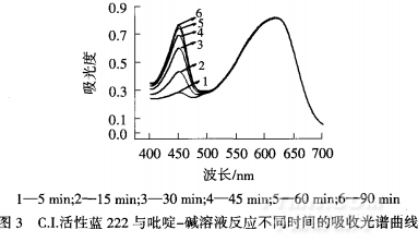 比色法中生成相對穩(wěn)定的有色化合物需要一定條件,且活性基不同,反應條件有所變化.[1]554對C.I.活性藍222與吡啶一堿溶液在50℃下反應不同時間后