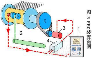 如圖 3 為一種 EBC 裝置簡圖。 控制終端 1 可以編制不同送經(jīng)量、顯示送經(jīng)速度并存儲花型數(shù)據(jù)。感測羅拉 2 測量實際送經(jīng)速度并以數(shù)字信號返回微處理器 4 ,微處理器 4 根據(jù)反饋信號控制伺服電動機 3 的轉(zhuǎn)速,從而控制經(jīng)軸線速度。