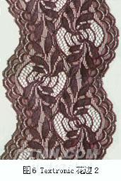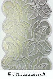 目前,采用RJWB8/2型Cliptextronic賈卡經(jīng)編機(jī)可以生產(chǎn)彈性或非彈性的,帶花環(huán)的或不帶花環(huán)的花邊。花邊底布結(jié)構(gòu)清晰,花紋精致,有立體效應(yīng),克重輕,成本低。這類產(chǎn)品在高檔婦女內(nèi)衣中應(yīng)用廣泛。Cliptextronic花邊如圖4所示。