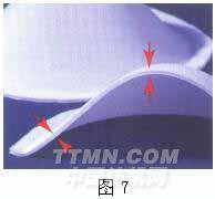具有三維立體結(jié)構(gòu)的經(jīng)編間隔織物有一定的壓縮彈性,且織物之間有充足的空隙,具有良好的導(dǎo)濕、透氣、溫度調(diào)節(jié)性能,耐洗性能和模壓成形性,是制作文胸罩杯的理想材料。間隔織物可直接模壓成文胸的罩杯狀,為穿者提供良好的生理支撐,保證胸部的外形挺括、優(yōu)美,同時還具有良好的穿著舒適性。因此,無論從生產(chǎn)還是服用角度來看,此類織物用作文胸罩杯材料,具有傳統(tǒng)的海綿襯墊不可比擬的優(yōu)越性。間隔織物用作罩杯材料如圖7所示。