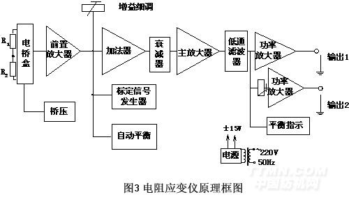 YD-28A型動(dòng)態(tài)電阻應(yīng)變儀的工作原理框圖如圖3所示,電壓輸出端1與帶USB接口的數(shù)據(jù)采集儀的輸入端相聯(lián)。其主要功能就是對(duì)采集的信號(hào)進(jìn)行放大、濾波 [3] 。