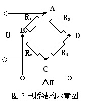 電橋按 120Ω設(shè)計(jì),在電橋盒內(nèi)有兩個(gè)120Ω精密無感線繞電阻作為半橋測(cè)量時(shí)的內(nèi)半橋, 外半橋采用兩片等阻值的工作電阻應(yīng)變計(jì) ,結(jié)構(gòu)如圖 2所示。U為供橋電壓;△U為輸出電壓;R 1 和R 2 為測(cè)量時(shí)外接應(yīng)變電阻計(jì);R 3 和R 4 為內(nèi)橋電阻。 檢測(cè)頭為一受力傳感器,采用一端固定梁式結(jié)構(gòu),梁的正反面中央各貼一片工作電阻應(yīng)變計(jì)。 電阻應(yīng)變計(jì)由極細(xì)的金屬電阻絲用粘貼劑牢固地貼在試件上,或用金屬箔片印刷在試件上 [3] 。