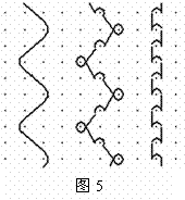 另外,由于底布是采用經(jīng)平組織,而前梳編鏈組織形成毛圈,在橫向沒(méi)有聯(lián)系,因此織物橫向受拉伸時(shí),如后梳有斷紗就會(huì)脫散,因此定形時(shí),破洞之間要用線縫好,防止通匹撕布。改善這種脫散現(xiàn)象的方法是:a.采用兩把梳櫛編織底布,b.更換地組織,如圖5所示,這樣毛圈沉降片也相應(yīng)改變。