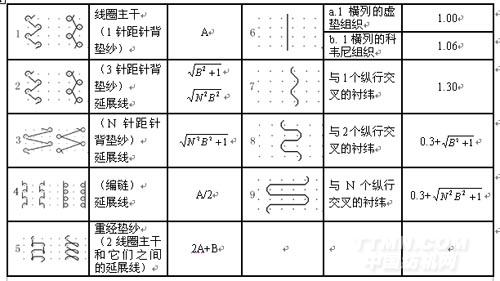 首先用A、B參數(shù)計(jì)算經(jīng)編組織的線圈估算單位數(shù)。構(gòu)成經(jīng)編基本結(jié)構(gòu)的各墊紗要素如圖1所示,對(duì)于各要素給出了橫列間隔為1時(shí)的單位數(shù)值或簡(jiǎn)單式子,它們分別由理論或?qū)嶒?yàn)方法求得(參數(shù)A、B可以根據(jù)機(jī)號(hào)、縱密、原料粗細(xì)查表所得)。