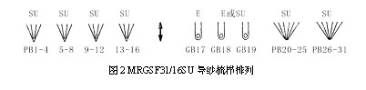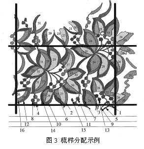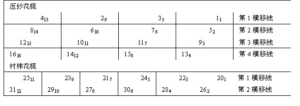 2. 梳櫛分配 相鄰導(dǎo)紗梳之間最少有2針距的距離,同一條橫移線內(nèi)梳櫛可以肩并肩地排列,根據(jù)同一原則來(lái)分配。如表1所示,采用這種奇數(shù)或者偶數(shù)梳櫛在機(jī)器同一側(cè)的分配方法,梳櫛在機(jī)器上的安排更加清楚。在使用壓紗板的經(jīng)編機(jī)上,梳櫛橫移較小的梳櫛一般放置在前面或者后面,因?yàn)樵诨ㄊ嶂g放置地梳櫛圖3為花梳分配實(shí)例。