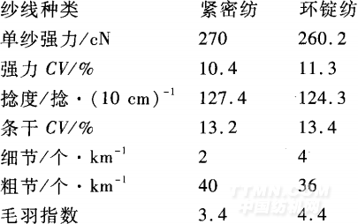 該品種采用的生產(chǎn)設(shè)備為$432型雙漿槽漿 紗機(jī)、ZA209i型織機(jī),單織軸織造,最少要26個 整經(jīng)軸,漿紗開車時穿絞線時間比較長,對值車工 的操作水平要求較高。Tencel品種上漿要求較 高,上漿大易脆斷頭,上漿小毛羽貼伏不好,漿紗 回潮率小靜電現(xiàn)象嚴(yán)重,同時緊密紡紗因為毛羽 少、表面摩擦力低,紗線在紗片中的相互位置容易 發(fā)生變動,容易與相鄰紗線發(fā)生捻纏現(xiàn)象。以上 問題處理不當(dāng)會造成漿紗時于區(qū)及伸縮筘處紗線 扭絞發(fā)生“簇梳”斷頭,即多根紗線發(fā)生扭絞而無 法順利通過伸縮筘造成的斷頭,好軸率很低,嚴(yán)重 影響織機(jī)效率和布面質(zhì)量。而Tencel 9.7 tex環(huán) 錠紗在漿紗時卻很少出現(xiàn)以上問題,為此,我們對Tencel 9.7 tex緊密紡與環(huán)錠紡成紗指標(biāo)進(jìn)行了 對比,結(jié)果如下。