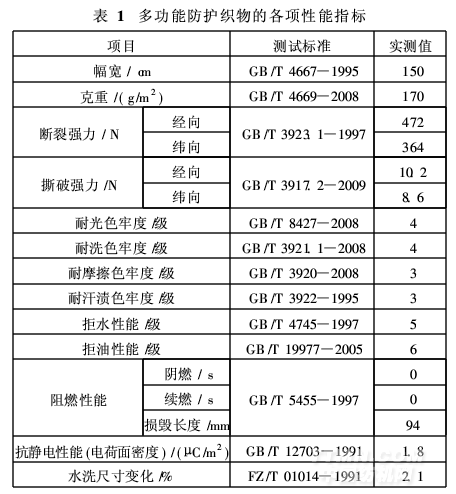 采用上述工藝生產(chǎn)的抗靜電/阻燃/拒水拒油多功能防護(hù)織物的各項(xiàng)性能指標(biāo)見表1。