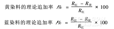 活性染料染色時(shí),造成染料追加率不同的因素有:長車連續(xù)軋染所用活性染料的直接性和反應(yīng)性,染料濃度及堿劑用量,以及軋槽染液交換速度。體積小的軋槽,染液的交換速度快,追加率應(yīng)調(diào)小;反之,軋槽體積大,染液更新速度慢,追加率應(yīng)相應(yīng)調(diào)大。另外,織物帶液量亦會(huì)影響追加率。在設(shè)定軋余率下,粗厚織物帶液量高,軋槽內(nèi)染液更新速度快,追加率應(yīng)調(diào)小;反之,稀薄織物帶液量少,軋槽內(nèi)染液更新速度慢,追加率相應(yīng)調(diào)大。同時(shí),車速快,則軋槽內(nèi)染液更新速度快,追加率就應(yīng)調(diào)小;反之,則相應(yīng)調(diào)大。在染色初期,拼色染料中的各染料由于直接性不同,導(dǎo)致其上染率也不同,小樣與大車下機(jī)差距較大,這是320軋染產(chǎn)品不符樣的主要原因。又由于320打底機(jī)軋槽體積是180打底機(jī)的1. 5~2倍,因此,活性染料的追加率是分析研究符樣率的重點(diǎn)。T/C產(chǎn)品采用分散/活性染色工藝時(shí),若試樣符樣率在4級(jí)以上,定此工藝為分散/活性的軋槽用料工藝;然后,根據(jù)計(jì)算出的軋余率,調(diào)整高位槽開車工藝。開車的工藝即是追加率的制定,一般可根據(jù)滲圈來確定染料的追加率。例如活性紅、黃、藍(lán)三原色拼色時(shí),將小樣處方染液滴在中速濾紙上,比較滲圈擴(kuò)散的大小,計(jì)算出每只染料在此類處方中的理論追加率。這里選擇比移值為0. 75~0. 8的紅色染料作為基準(zhǔn),以計(jì)算理論追加率: