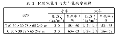 化驗(yàn)室小樣軋車與大車軋車軋余率的相符性,亦是影響符樣率的關(guān)鍵因素。如果兩者軋余率相差較大,會(huì)導(dǎo)致染料上染率不同?;?yàn)室小軋車由于車速慢,軋輥線速度低于大車,軋輥對(duì)布的作用時(shí)間長,相同軋余率下帶液量少,因此小樣的軋余率需提高5% ~10%。根據(jù)320寬幅家紡軋染生產(chǎn)線的生產(chǎn)情況,摸索出化驗(yàn)室小樣與大車相對(duì)應(yīng)的壓力,具體工藝參數(shù)見表1。