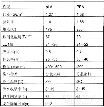 聚乳酸纖維的基本化學(xué)組成是,分子鏈中沒有強極性基,但存在較多的酯基,碳鏈上還存在等距排列的甲基,因此該纖維具有合成纖維的特性。其與常規(guī)滌綸聚酯(PEA)纖維物理性能的比較如表1所示。