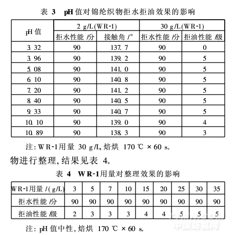 由表3可知, pH值的變化對錦綸拒水效果的影響不顯著,但對拒油效果的影響明顯。當(dāng)pH值在3左右時,拒油效果基本沒有;當(dāng)pH值大于10時,拒油效果逐漸下降。因此,WR-1工作液近中性時,拒水拒油整理效果最佳。
