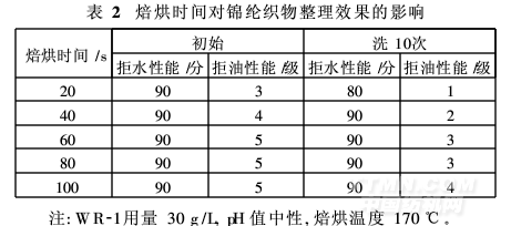 由表2可知,延長焙烘時間,含氟整理劑WR-1在錦綸織物上的交聯(lián)程度逐漸提高,織物的拒水、拒油及耐洗效果提高。焙烘60 s后,繼續(xù)增加焙烘時間對拒水拒油及耐洗效果影響不大,且長時間焙烘會使織物產(chǎn)生黃變,因此確定焙烘時間為60 s。