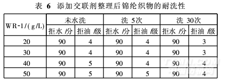 表6中,整理劑WR-1用量為40 g/L,交聯(lián)劑用量為6 g/L,標準洗滌30次后,整理織物的拒水拒油效果仍達90分和4級,可滿足客戶要求。對耐洗要求較高的客戶,建議WR-1用量在40 g/L以上。