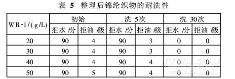 (4)對于耐洗性要求較高的拒水拒油產(chǎn)品,整理工作液中可添加適量的交聯(lián)劑(用量為WR-1的15% )。