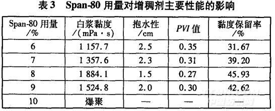 從表3可知,隨著乳化劑用量的增加,體系中膠束 總濃度增加,聚合物相對分子質(zhì)量增加,故增稠效果提 高;繼續(xù)增加乳化劑用量,白漿黏度下降,甚至出現(xiàn)爆 聚現(xiàn)象。從抱水性、流變性和耐鹽性來說,Span一80用 量為單體總用量8%時的效果較好。