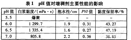 改變pH值(5.5,6.0,6.5,7.0),按1.3節(jié)方法合成增稠劑。將增稠劑配成1%的白漿,測試其主要性能,結(jié)果如表l所示。