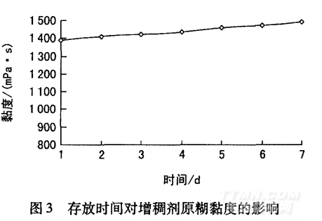 由圖3可知,增稠劑原糊放置于室溫一周后,黏度 稍有增加。原因是原糊暴露在空氣中,少量水分蒸發(fā)。 存放一周后,原糊沒有出現(xiàn)變質(zhì)腐敗現(xiàn)象,說明合成增 稠劑不易受微生物侵襲,溶脹后的體系是穩(wěn)定的。 此外,將放置不同天數(shù)的活性染料印花色漿置于 離心機(jī)上,未發(fā)現(xiàn)分層和沉淀現(xiàn)象。自制增稠劑放置 半年后,也未出現(xiàn)分層和變色情況。