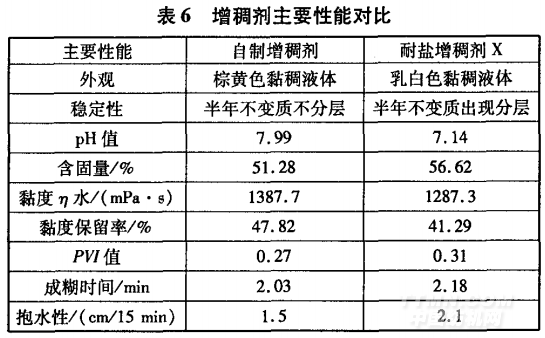 按照優(yōu)化工藝條件制備增稠劑,測試增稠劑的主要性能指標(biāo),并與市售耐鹽增稠劑x進(jìn)行比較,結(jié)果如表6所示。
