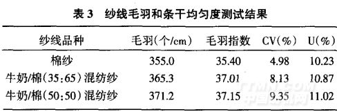 表3是對2mm及以上的毛羽測試結(jié)果,因為2mm以下的對紗線后道加工影響不大,從數(shù)據(jù)可以看出純棉紗的毛羽較混紡紗的少,分不均度也比混紡紗均勻。在條干均勻度方面棉紗均好于混紡紗。