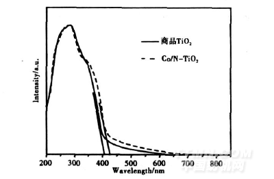 圖3是商品TiO2和Co/N-TiO2的紫外-可見漫反射光譜圖。