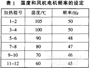 為了盡可能改善絲光色紗手感和柔軟性.采用較低溫度和慢烘干 工藝.設(shè)定溫度自進(jìn)口端遞減 由 于濕紗在烘箱中經(jīng)歷從濕態(tài)至干 態(tài)的變化.故從保證紗線不吹亂 和節(jié)能兩方面考慮.當(dāng)所用烘箱 配置風(fēng)機(jī)電機(jī)變頻器時(shí).應(yīng)按前 后箱號(hào)從高至低設(shè)定不同轉(zhuǎn)速 具體溫度設(shè)定和風(fēng)機(jī)電機(jī)的頻率 如表1所示