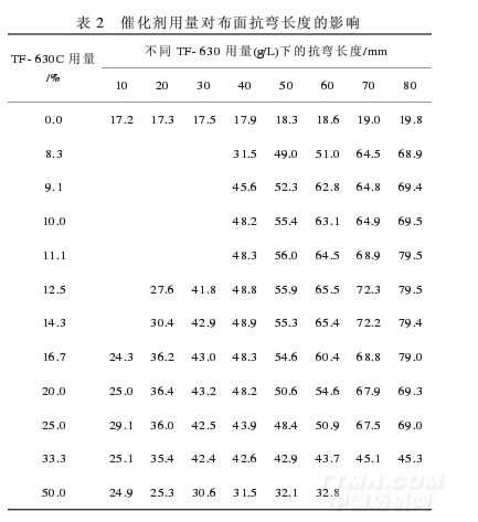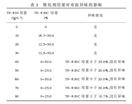 從表1~表3可看出,TF-630C用量應(yīng)控制在一定范圍內(nèi).隨著TF-630用量的變化,TF-630C用量也應(yīng)相應(yīng)調(diào)整.原因是合適的催化劑用量可使TF-630在較短時(shí)間內(nèi)充分反應(yīng),有效控制游離甲醛含量.如果催化劑用量偏小,會(huì)使反應(yīng)不充分,導(dǎo)致游離甲醛含量增加.而催化劑用量偏大,則會(huì)使反應(yīng)朝逆向進(jìn)行,造成TF-630水解,游離甲醛含量也增加.TF-630C作為TF-630的催化劑,在配制時(shí)已充分考慮其化學(xué)反應(yīng)活度(催化力),活度大可降低焙烘溫度或縮短焙烘時(shí)間,完成交聯(lián)作用.結(jié)合工廠應(yīng)用情況,一般輕漿(TF-630 10~30 g/L)催化劑TF-630C用量為12.5%~25.0(對(duì)TF-630質(zhì)量,下同);中漿(TF-63030~50g/L)為12.5%~20.0%;重漿(TF-630大于50 g/L)為10.0%~16.7%.